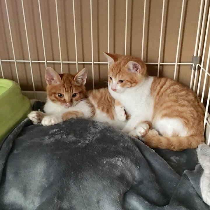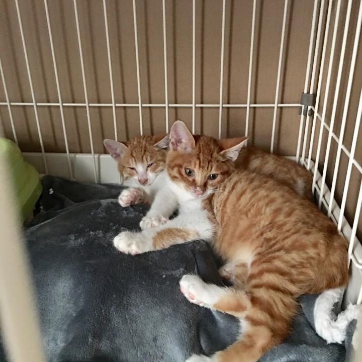 兄妹が6日ぶりに再会した。先に保護した向かって左側がちゃちゃくん。右側が、昨日、保護した茶白の名前は、そうだな〜みたらし団子みたいだから、だんご、そう、だんごちゃんにしよう(^^)