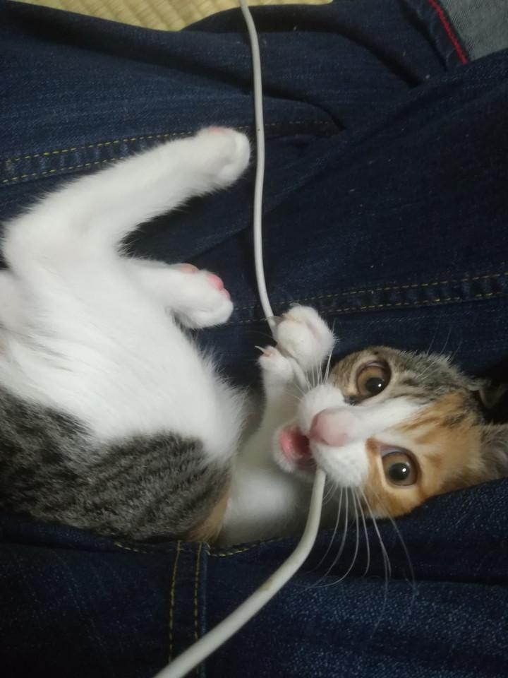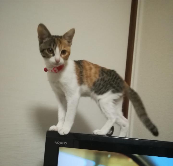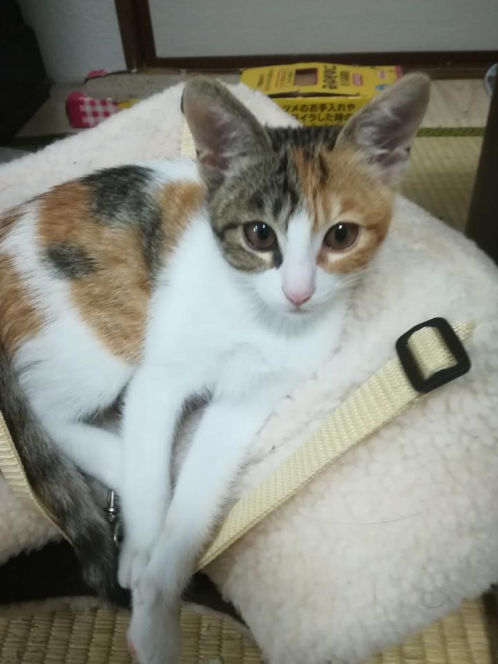 三毛子猫は交通事故で後ろ足を脱臼して踞っていたところを保護され、治療を受けて完治したので里親にと言われて家族に迎え入れました。