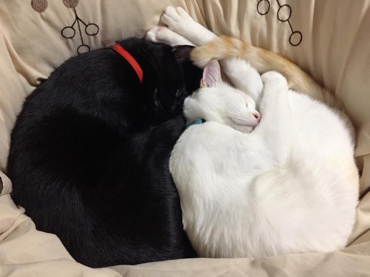 最初は2匹ぎちぎちでぬくぬくしてるんですが途中で黒い方が狭くて出て行ってしまうんですね。