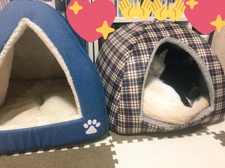 2匹ともチェック柄の三角のキャットハウスがお気に入りで、黒いのが先に入っていると白いのが後から押し入って