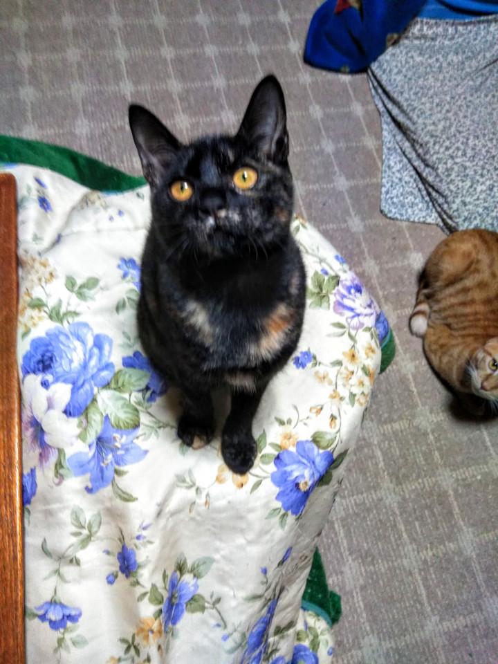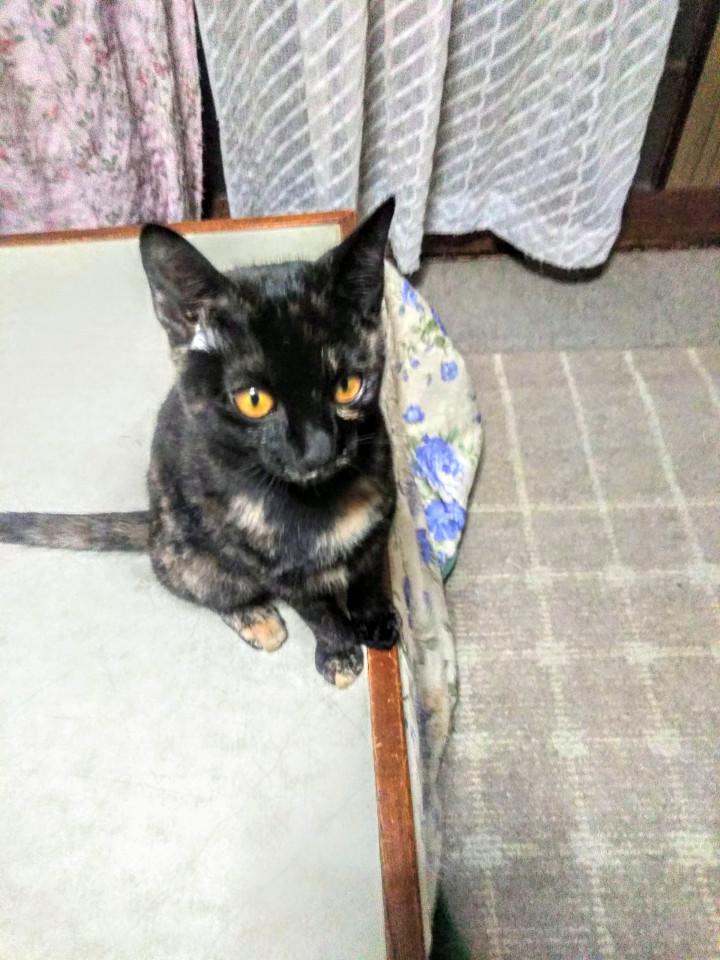 なのに、ひげ模様や目の下の白いアクセントなど、"ん?"と思わせる柄ですが、それでも人懐こく膝にのって来る、おとなしい女子です。