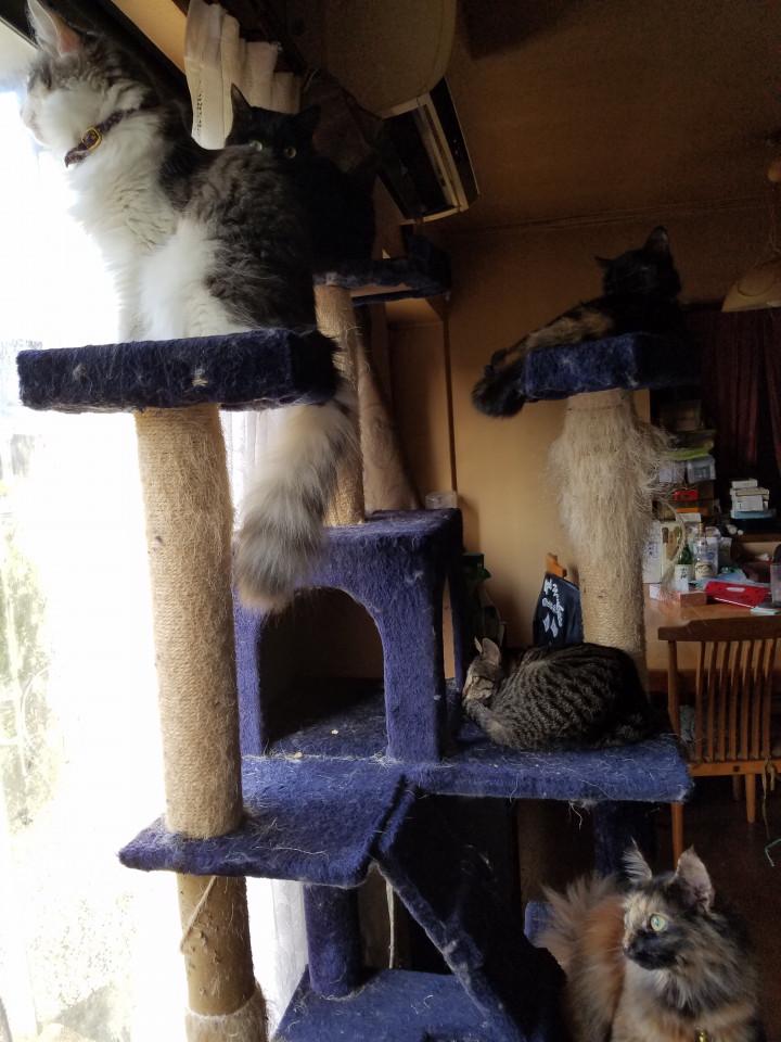 こんな小さな(?)キャットタワーに、5ニャンずが集まっていた😆