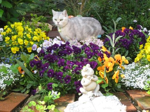 今日は花壇で一日限定の知者猫(チシャネコ)のオブジェになってあげるよ。