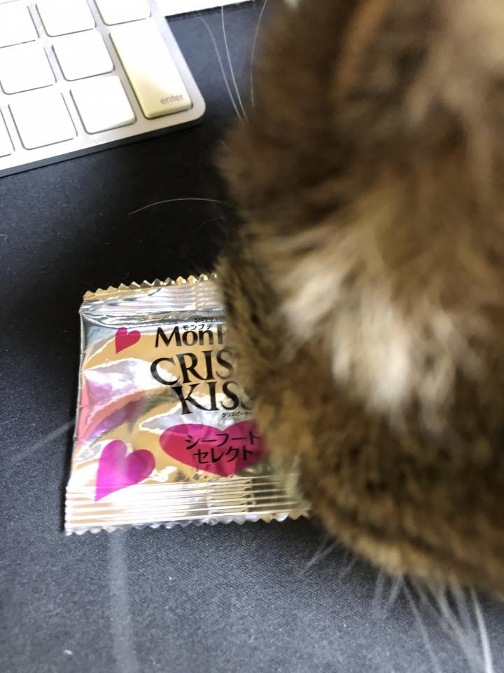 先ほどおやつのモンプチのクリスピーをあげたら、