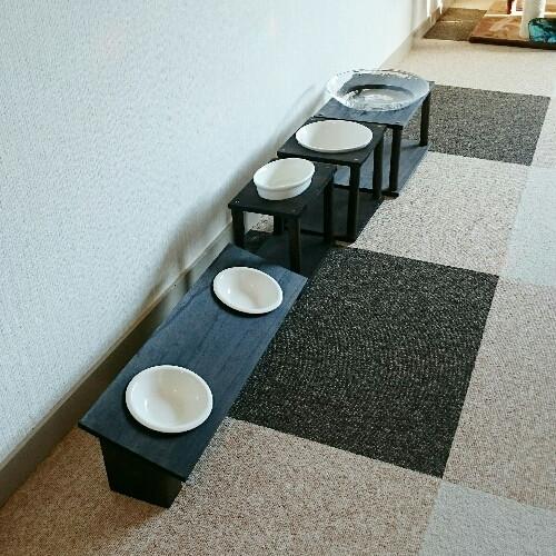 『猫の學校』で推奨されてた、「ごはん台:高さ9㎝」「水入れ:高さ20㎝」を自作。