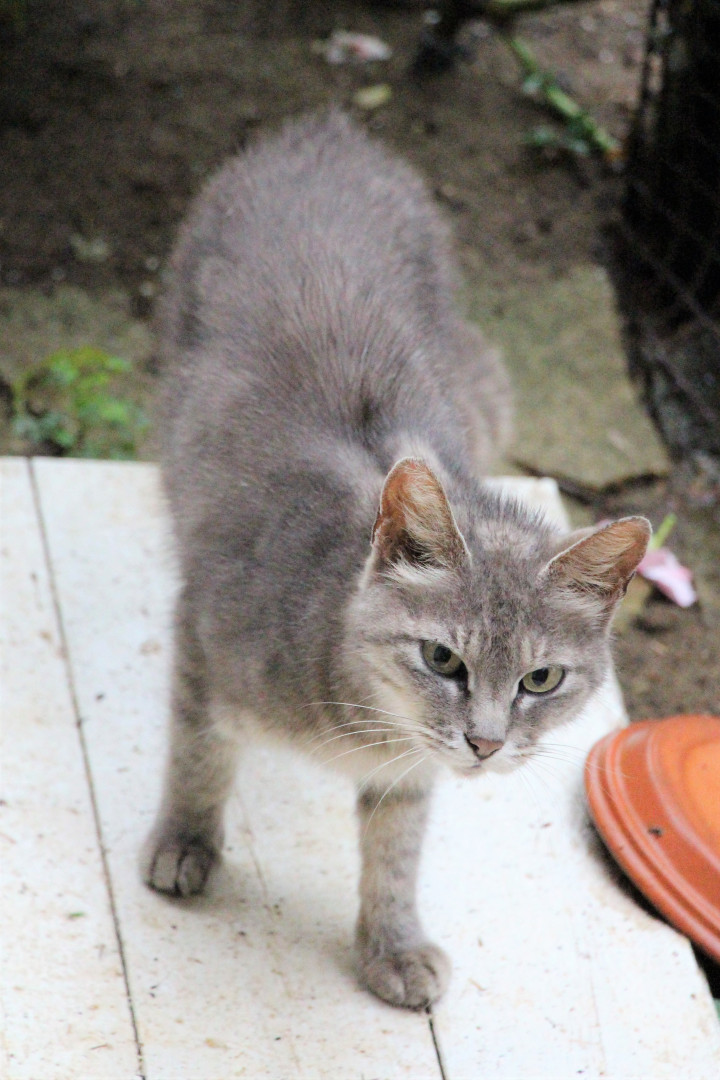 グレーの ロシアンブルー風にも見える綺麗な猫です。