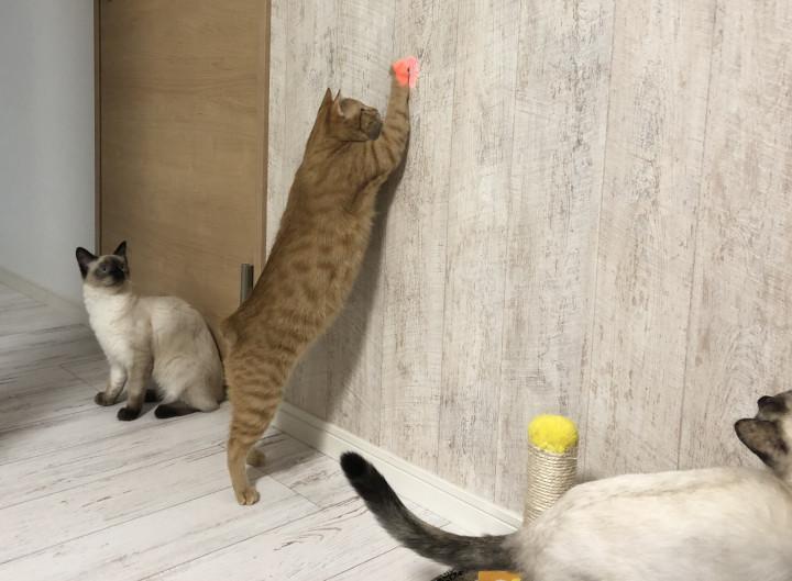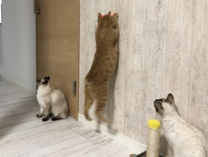 今日は息子がレーザーポインターで猫達と遊んでいました