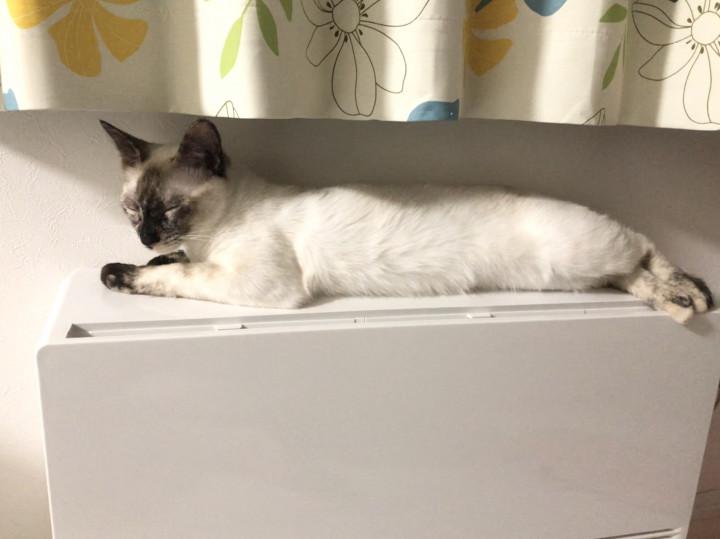 美鈴は暖房機の上が暖かい事に気付いたのか、最近直接乗っかって寝ています