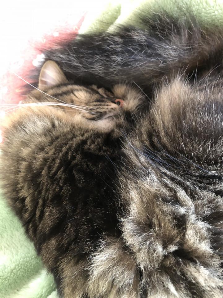 モモは眠くなるとチョコの顔の辺りで寝ていました。夜は私はチョコと寝ていましたがモモは猫なので遊んでいました笑