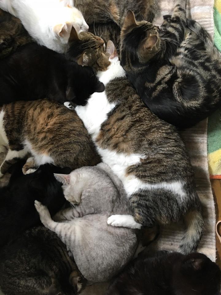 猫団子は大体2箇所に分かれますが、毎回猫たちの柄などで団子の模様が違います。これは猫たちが作る作品だなぁといつも思います。