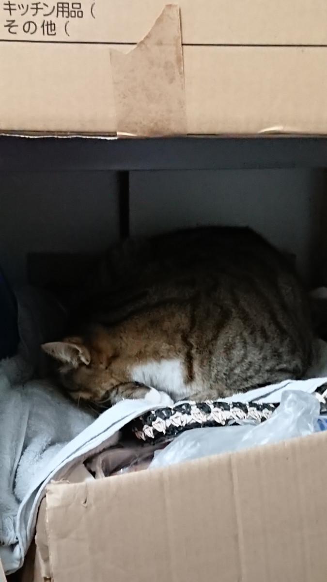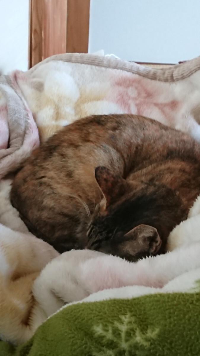 戦いに敗れたりんちゃん、2階の和室でお布団畳んでいる上で寝ました…