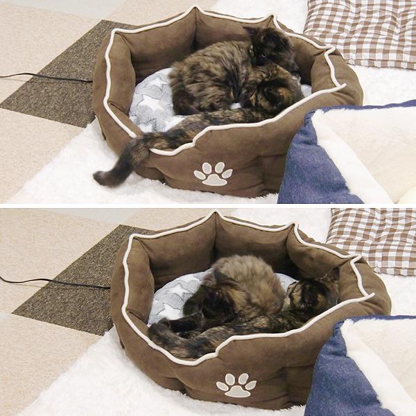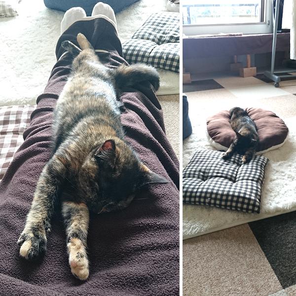 こんな体勢(写真左)で、眠くてウトウトしていても、カラは撫でられるのを嫌がります。