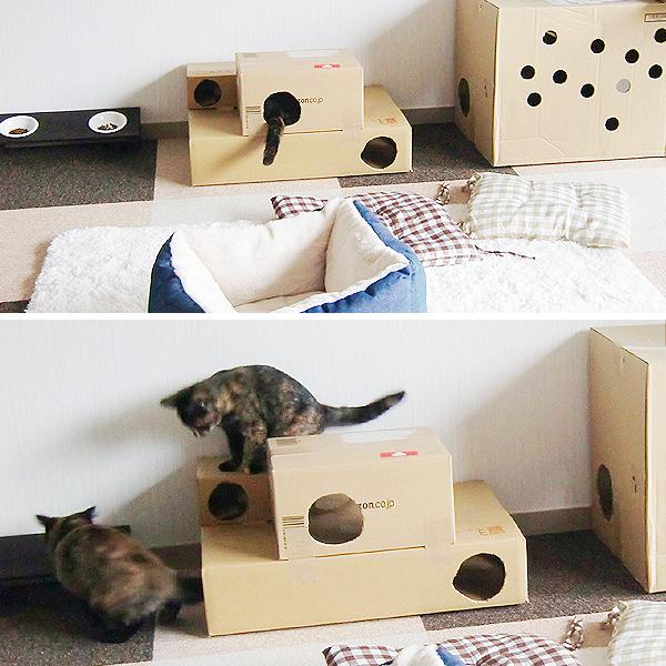 姉妹を迎える前日に興奮しすぎて眠れずに作ったダンボールステップ(中央)。ステップとしては無用でしたが、遊具としては使ってくれております。