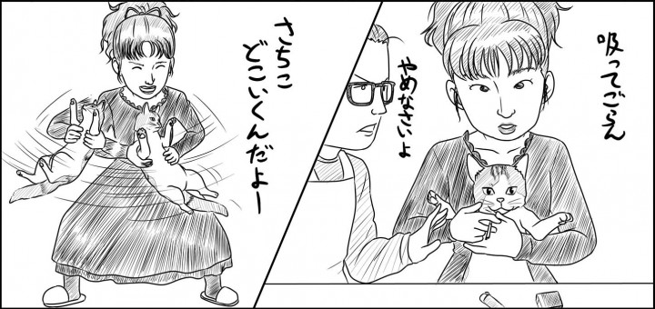 普段は猫がいる振りでやっていますが、たまに実物(さちこ、ナガヤマ)が出てくる回もありました。