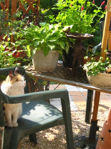 外の三毛猫ちゃんは椅子(やっぱり人間用。^^;)で寛いでいます。いつもおとなしいニャンコです。オブジェにはぴったり?^^