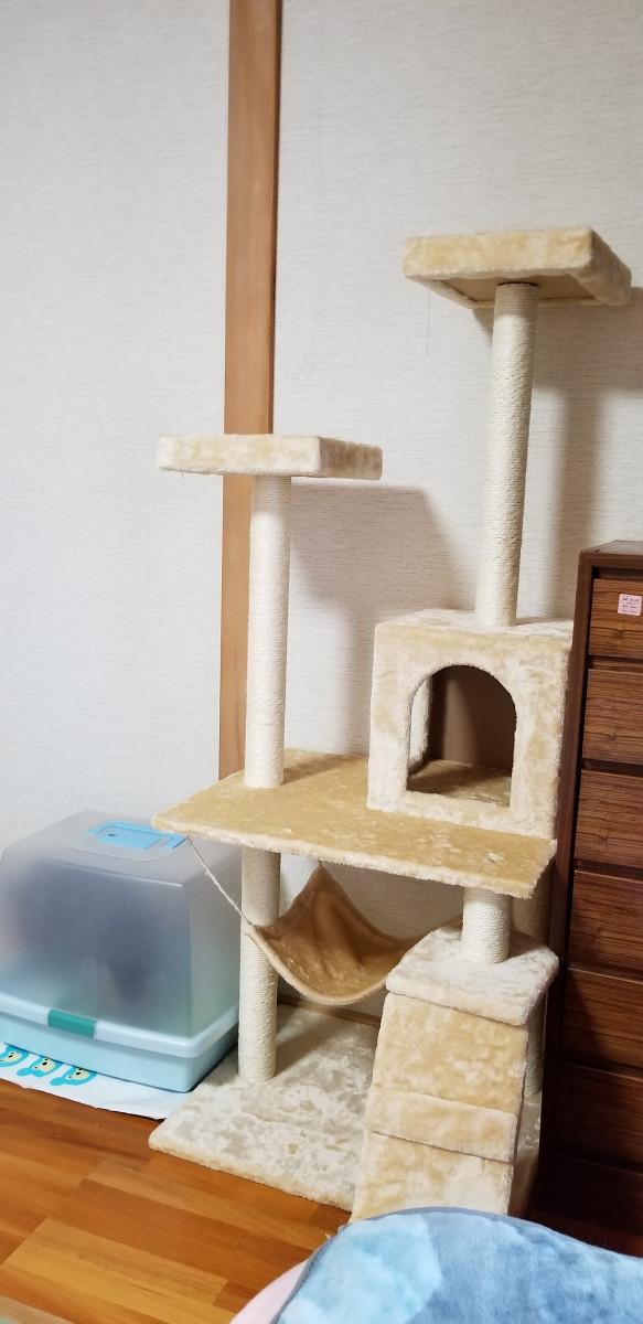 その部屋は床板の部分にはダイエット器具を置き唯一母の古いタンスだけが置かれているのですがキャットタワーはその横に設置場所してタンスにも乗れる用にしてキャットタワーの横に猫トイレを設置いたしました。