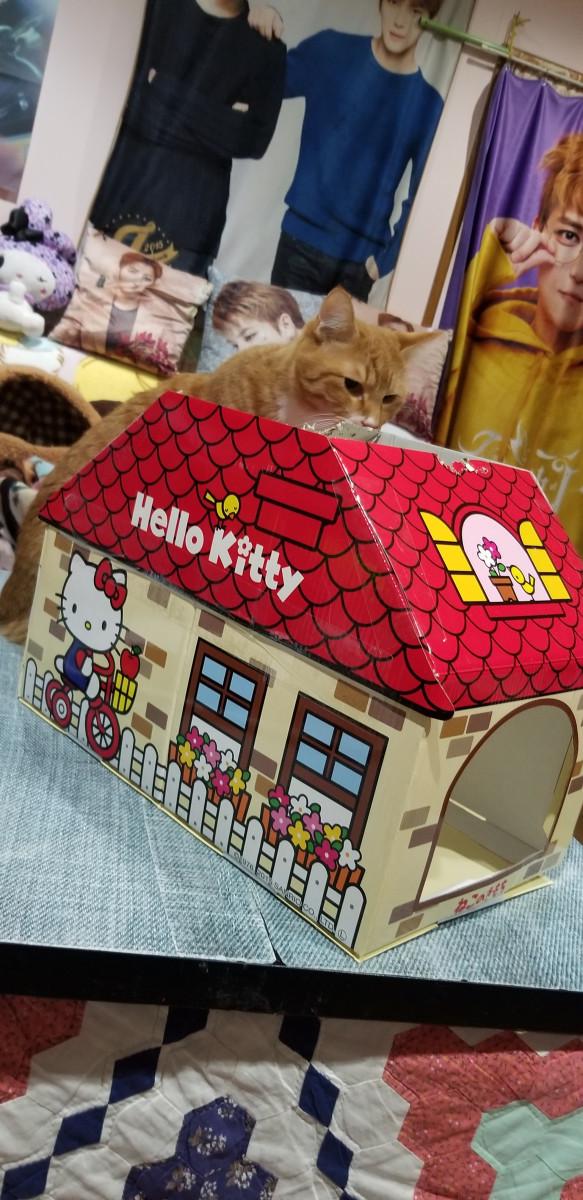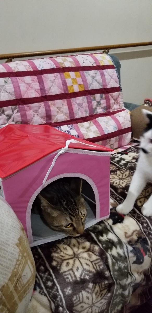 段ボールハウス(キティ)は頭の方をかじられビニールハウスは簡易屋根が潰されるという遊びでぼろぼろ!