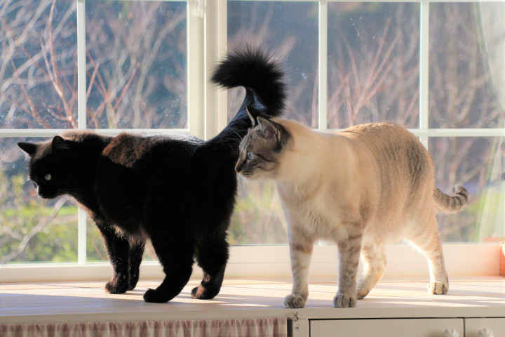 猫たちが外を見たり、日向ぼっこしたり