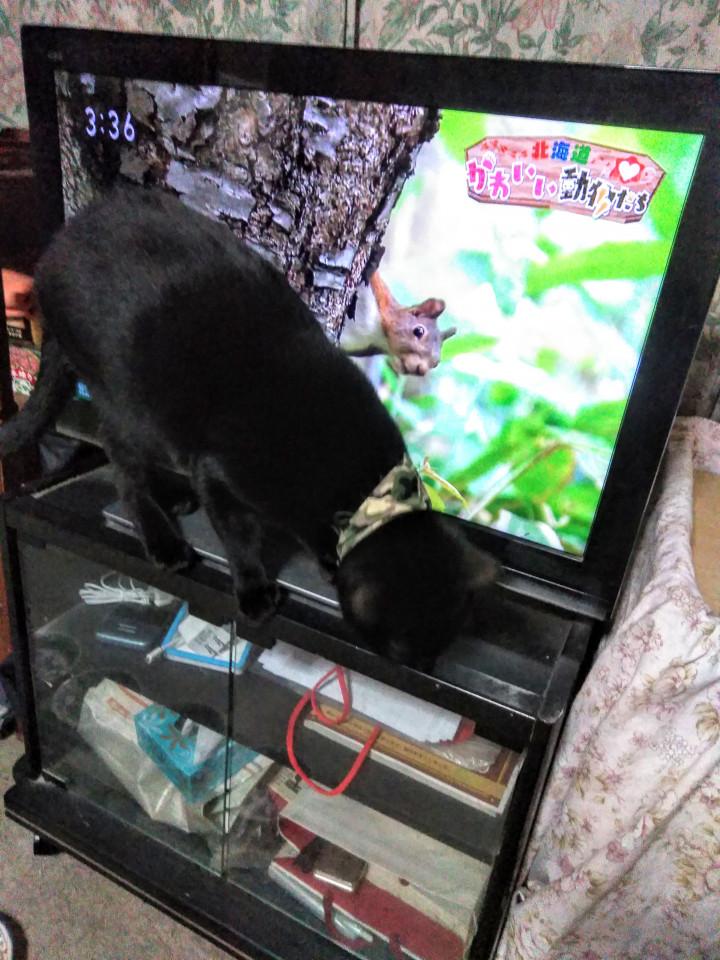 リスが出て来ると、じぃ〜っと見つめて"なんだろ、こいつ?"
