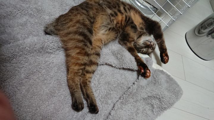 飼い主の心配をよそに、走り回って遊んで疲れたのか、相変わらずストーブの前で伸びてるし…
