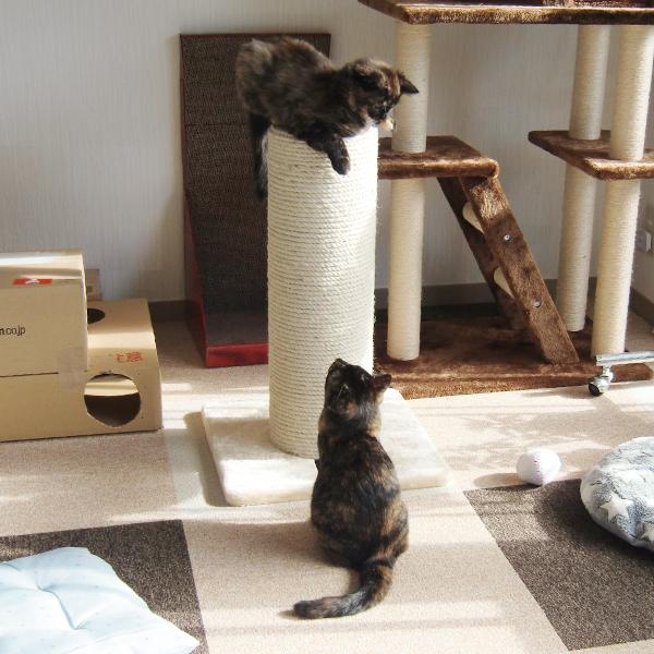 ポールにはネズミのオモチャがついていて、じゃれている内に爪研ぎの気持ちよさに目覚めるつくりだったのですが、カラさんは正確にオモチャだけを狙い、5分足らずで千切ってしまいました。