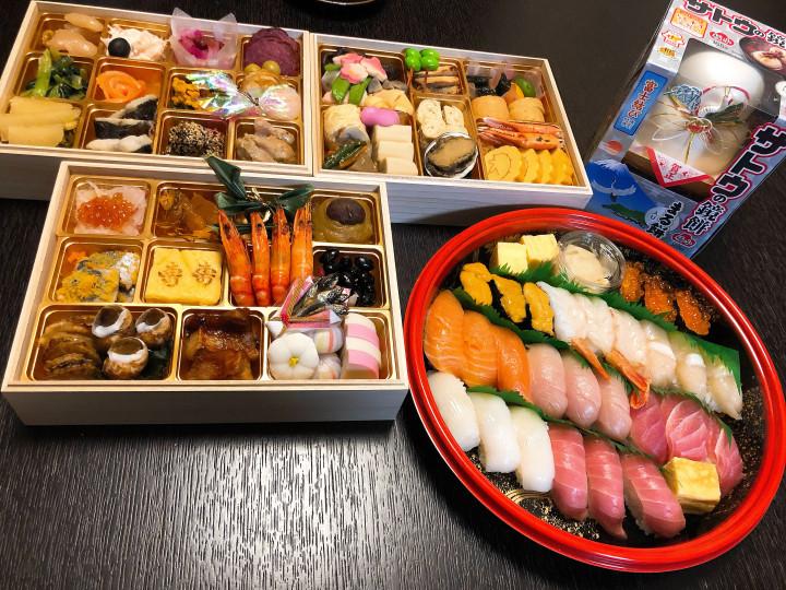 届いたお寿司を並べて新年会はじまり〜♪