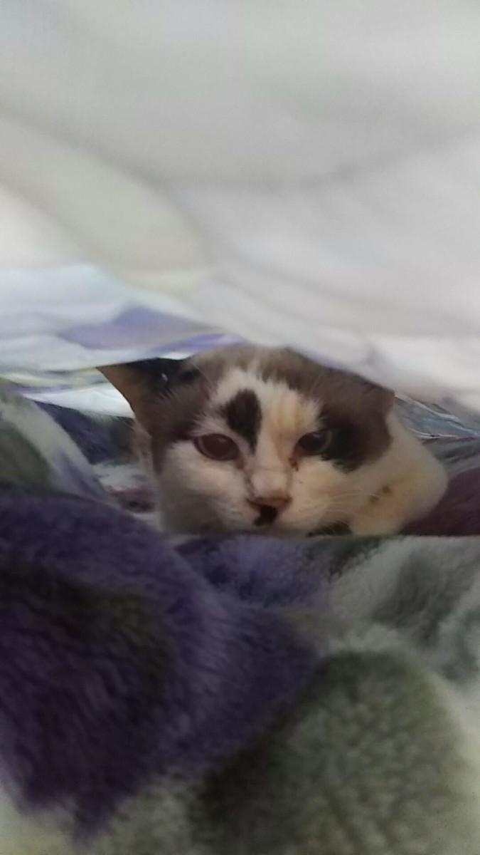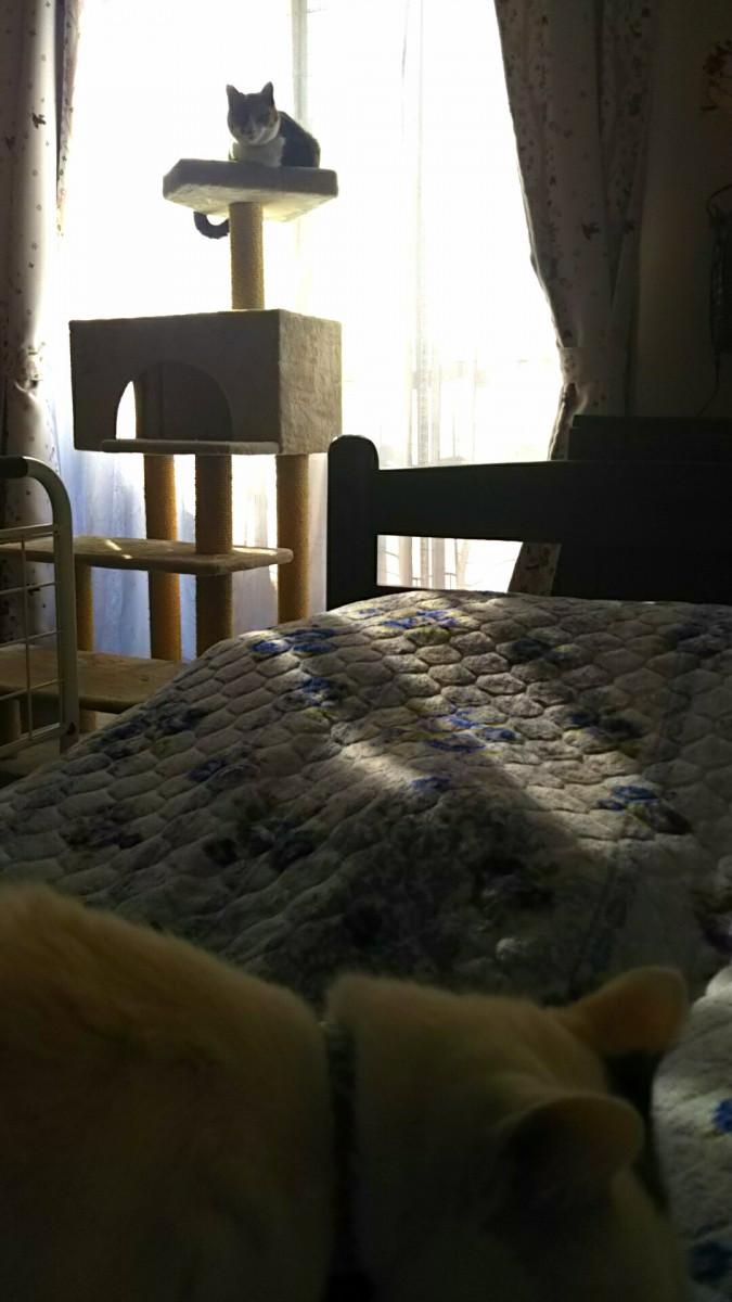 ベッドの上、手前の盛り上がった所にチカコが居ます。