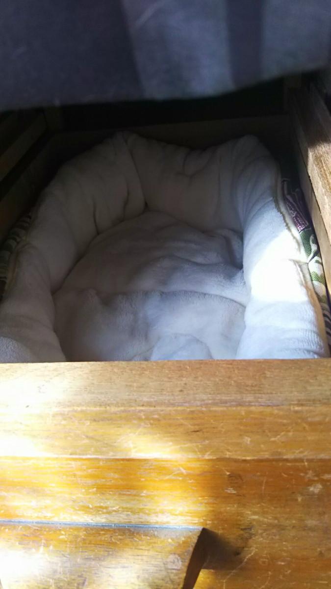 元旦から夜なべをして作ったベッドを、チカコの新居(古い机の引き出し)に入れてみたけど、全く使ってくれず。
