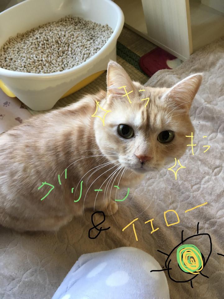 日本猫に多い濃いイエローではなくて薄くて緑がかっていて…たぶん洋猫要素がプンプン。