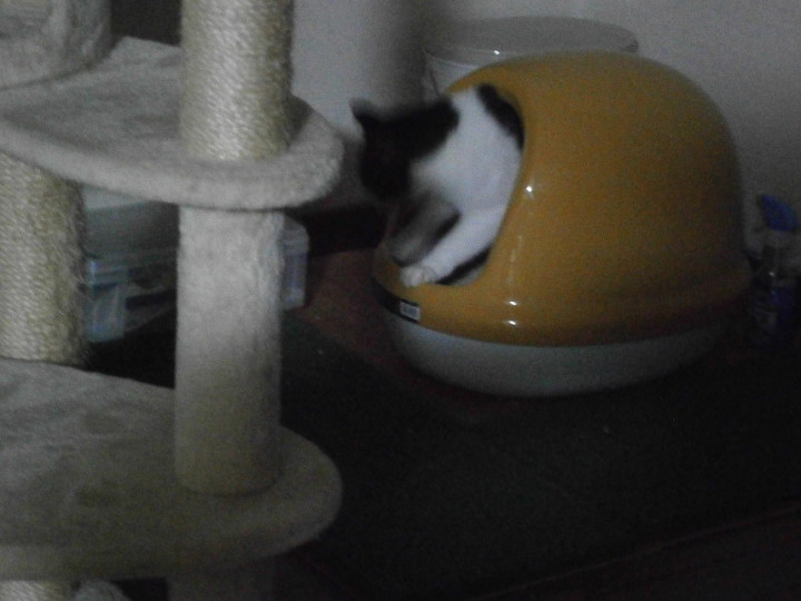 そしてごめんなさい・・・おトイレを盗撮^^; しおみちゃんは用を足した後、砂掻きをやるのですけど、本ネコは一生懸命に砂を掻いてるつもりでも、写真のようにトレイの端を掻き掻き・・・^^;