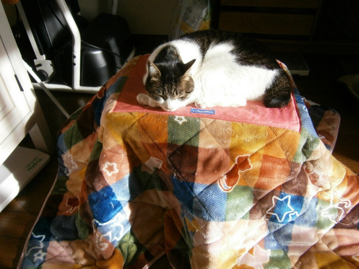 ニャンコタツの上もお気に入り♪ ヒーターの熱が伝わっていて上面も暖かいんですよ^^