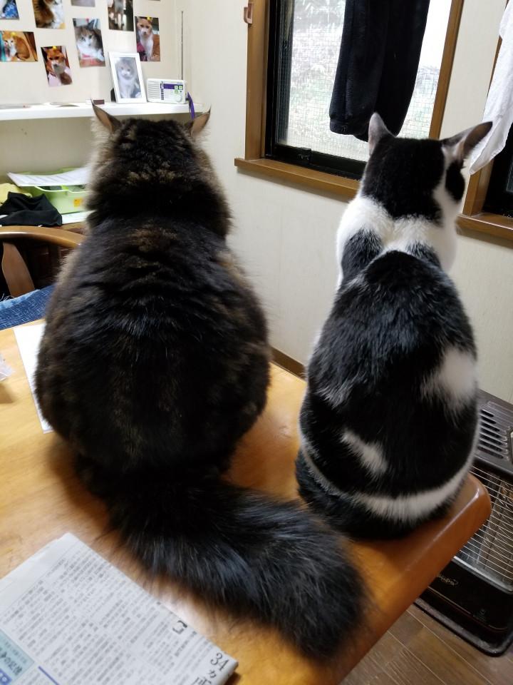 出かけたいけどストーブの真ん前のテーブルの上に座ったまんま寝ようとする2匹を見てたらストーブを消すタイミングが分からなくなる私(笑)