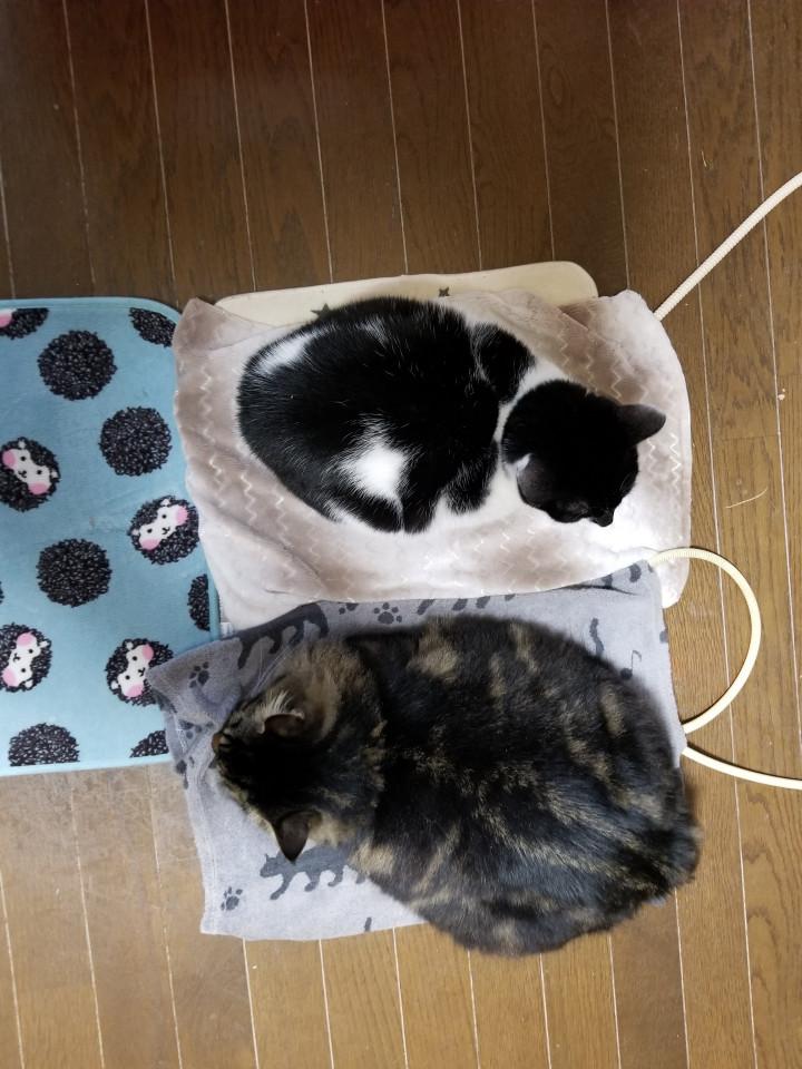 ペット用のホットカーペット?マット?に座る時、何故かお互い頭とお尻を反対にして座る2匹が面白くて可愛い親バカな私でした♥️