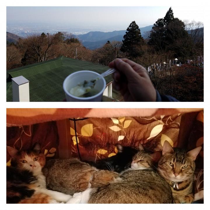 この写真は阿夫利神社で食べた七草粥と、うちの子こたつに全員集合❗の図です。