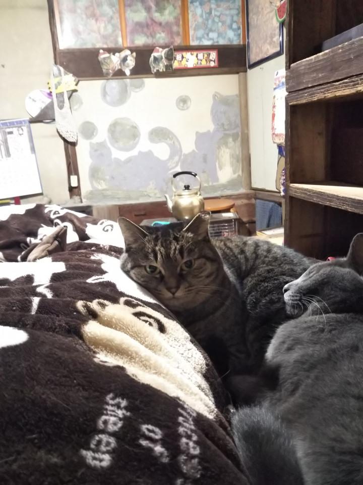 下に一畳分のホットカーペットがあるのでにゃんずが集まってきます