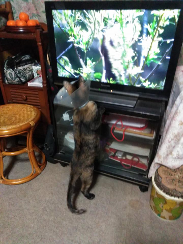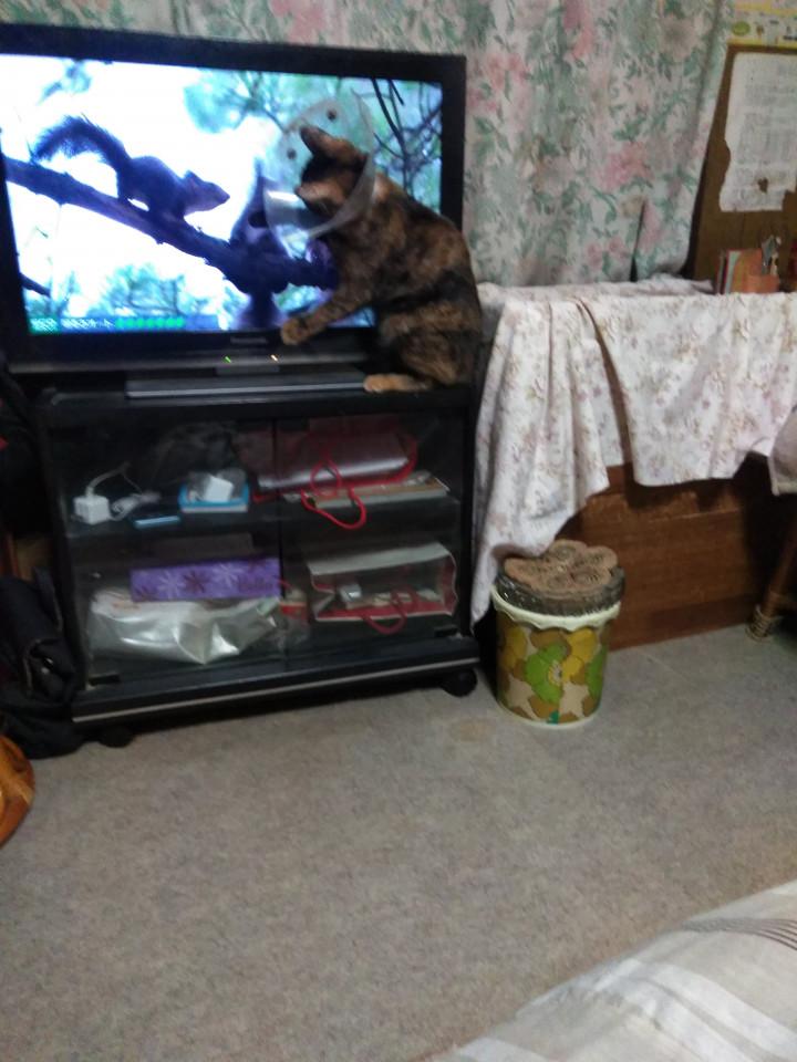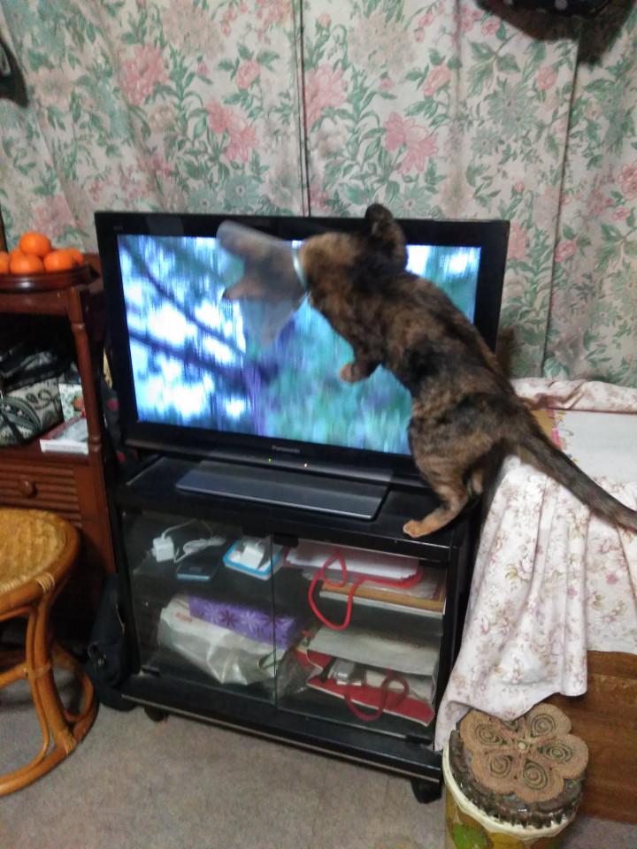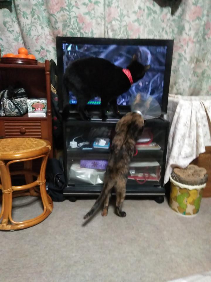 それを見て、クーちゃんが参戦。テレビ台に乗っかるという迷惑行為。