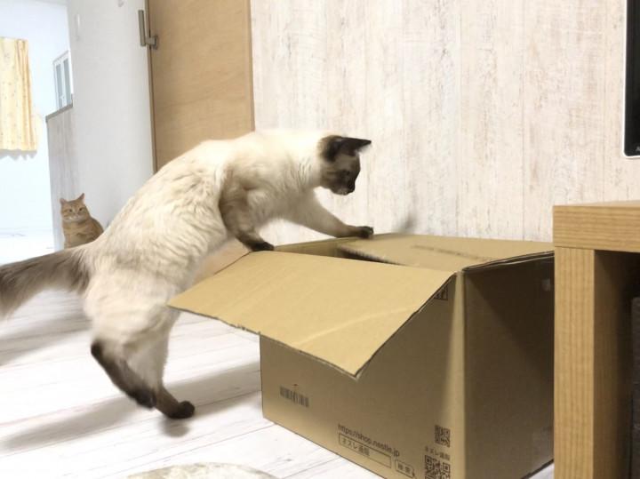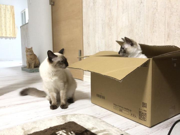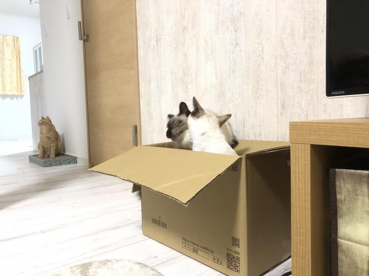 昨日ピュリナワンの定期便の箱を開封したので、またもや姉妹の箱争奪戦に