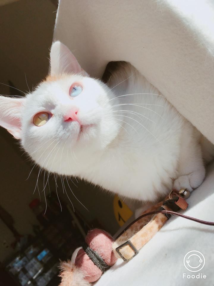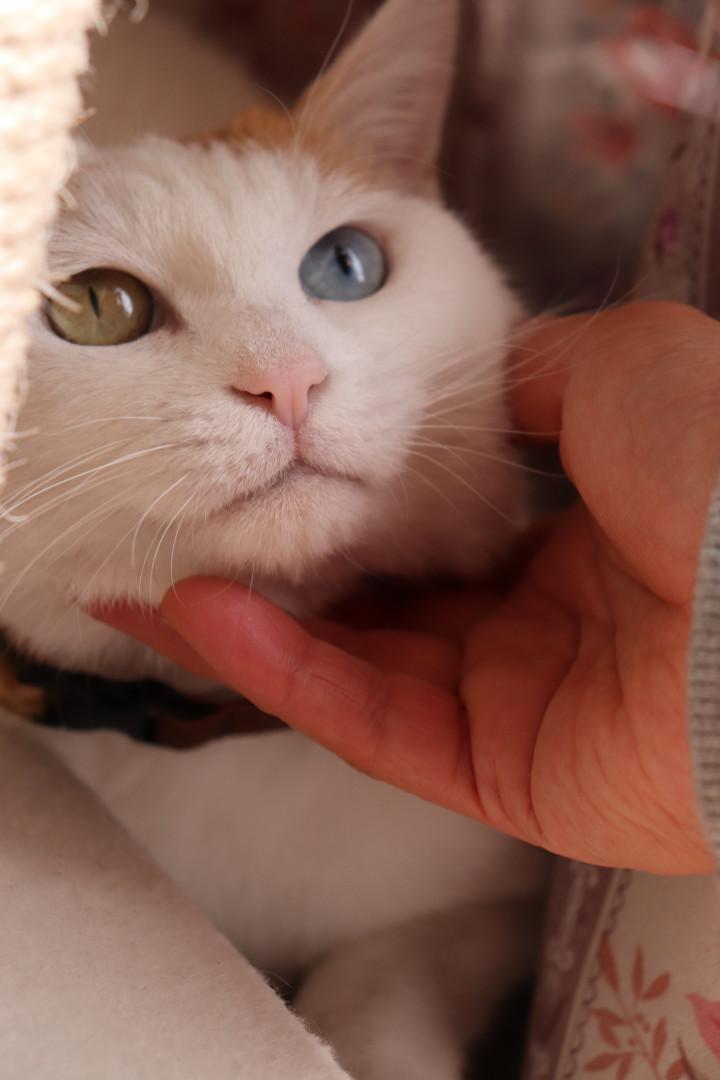 オットアイの三毛猫です。頭と尻尾が三毛で、体は白。
