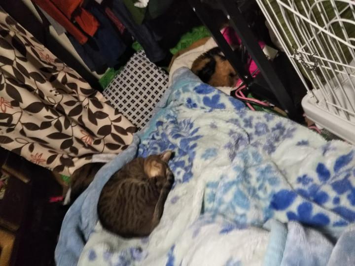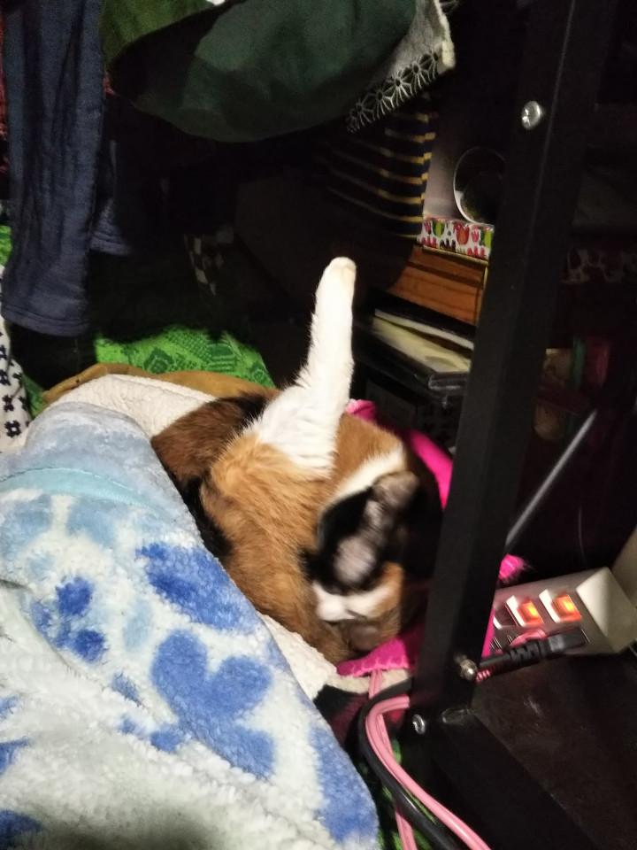 ゲージ、パソコン、間にホットカーペットに毛布と