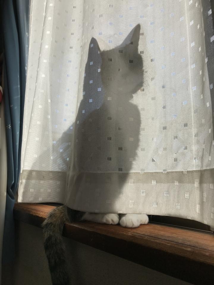 レースのカーテンの向こうに潜んでるよ…だ〜れ〜か〜にゃ〜??