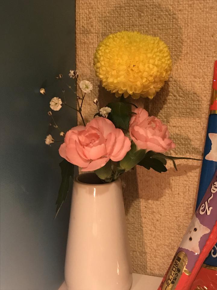お花も妹がきなちゃんのイメージでまん丸いお花の花束を選び、花瓶に入れてくれました( ﹡・ᴗ・ )b