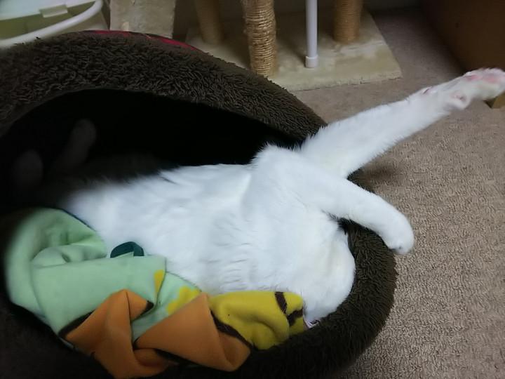 頭がすっぽりハマってます。この状態で寝息をたてるちーちゃん…お顔は上を向いてるので大丈夫みたい(=^ェ^=)。