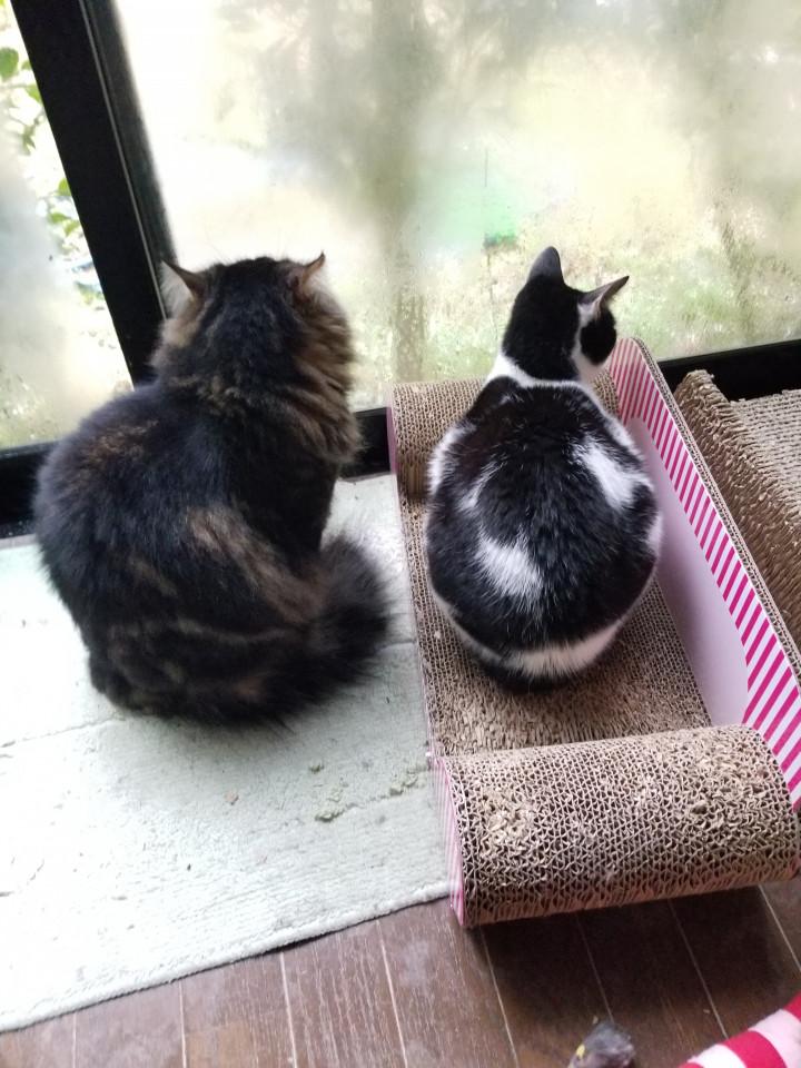 外を歩くクロちゃんを見るおはぎときなこ(笑)