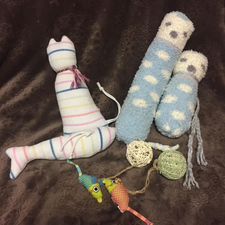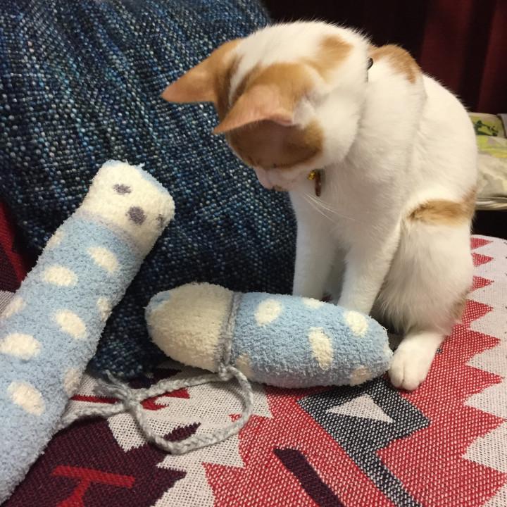 100均のモケモケ靴下に綿とまたたびとセロハンと鈴を入れて閉じたモノ。