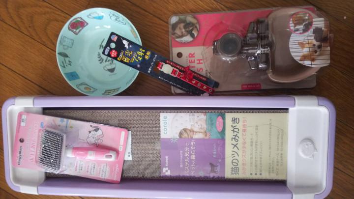 爪とぎに、ケージにつけるお水飲むのと、お皿に、ブラシに、首輪😆✨