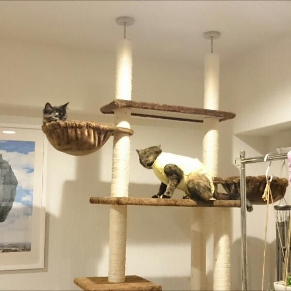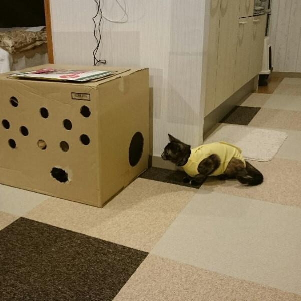 ウチは猫ロフトへの道が真っ直ぐな登り棒のため、エリザベスカラー着用時の転落回避のつもりで術後服を用意したのですが、カラさんには合わなかったか。うーん、失敗。