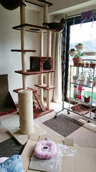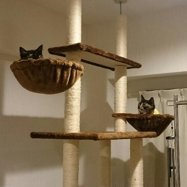 軽やかにキャットタワーに登るメルさんを、不自由な体でよろよろ追いかけるカラさん。無理しないでカラさん!