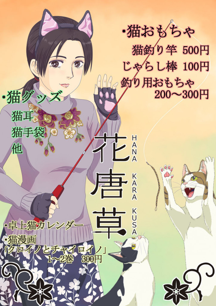 漫画以外にも手作り猫用オモチャや、猫釣り竿、猫用ハーネスなども出品します。