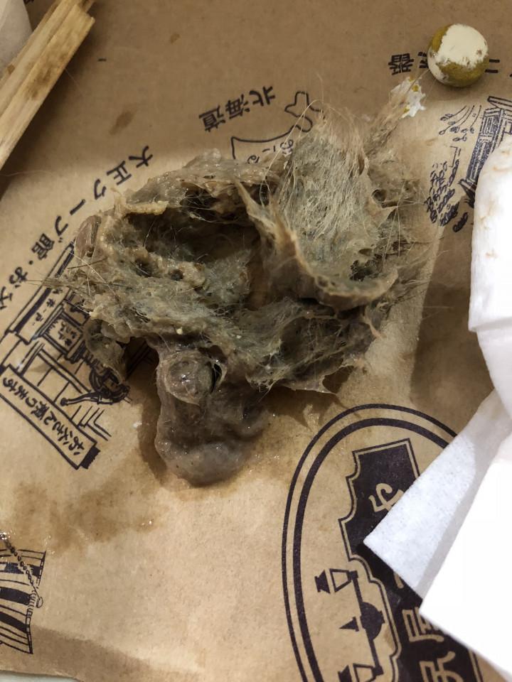 「吐いたのと💩持ってきました。昨日の毛の塊も。」