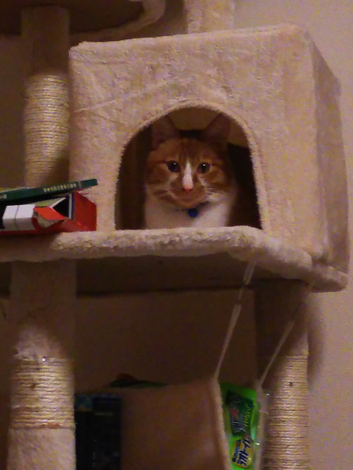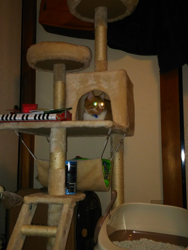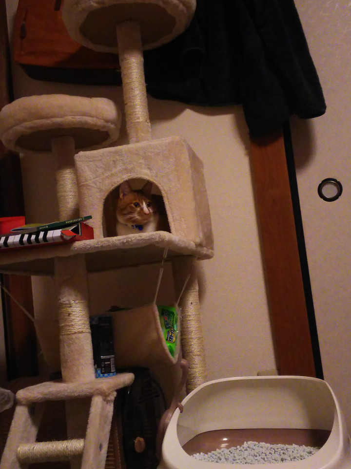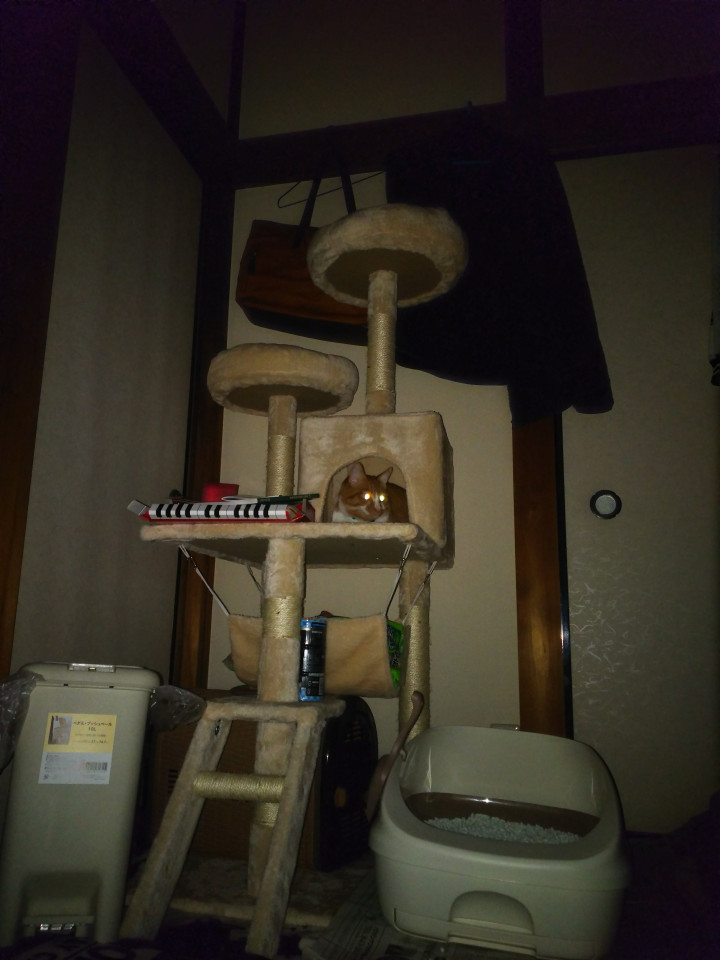 自分の頭方面に、キャットタワーがあるが、優の足音が聞こえなくなり、ゲージに入って寝てるのかと思ってたが、なにやら上の方でガサガサ♪